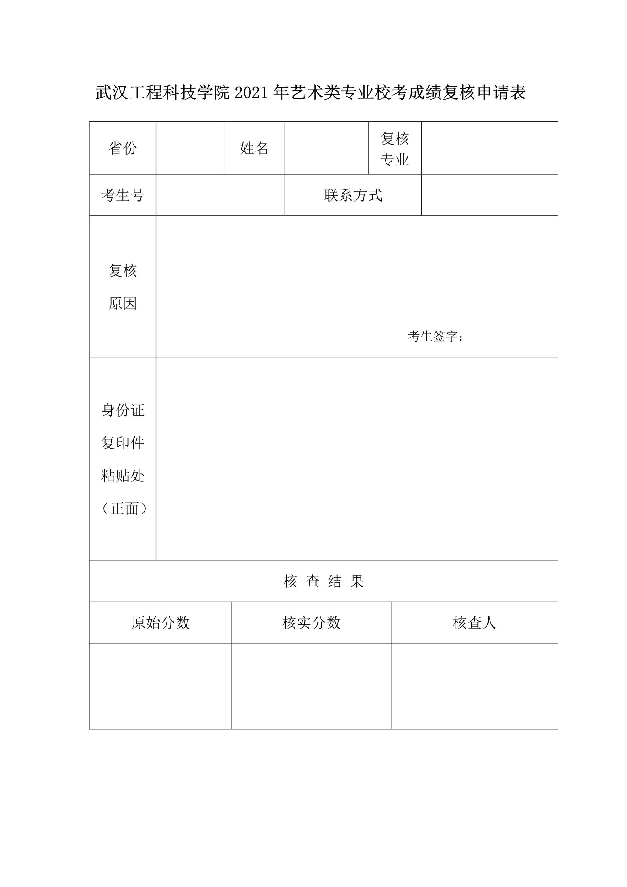 2、考生如对本人考试成绩有异议,请于4月25日中午12点之前(逾期不再受理)向我校提出复核申请。申请方式如下:下载并填写《武汉工程科技学院2021年艺术类专业校考成绩复查申请表》,按照表格要求粘贴身份证、准考证,签字后扫描或拍照(请保持画面清晰)发送到邮箱81088987@qq.com(不接受现场复查手续办理)。学校收到复查申请后,招生处将在我校纪检监察部门监督下对提出复核申请的成绩进行复核,在两个工作日内予以电话或邮件回复结果(成绩复核只复核是否存在漏评、漏阅、登错分,不重新评卷,不涉及评分标准宽严程度的掌握)。